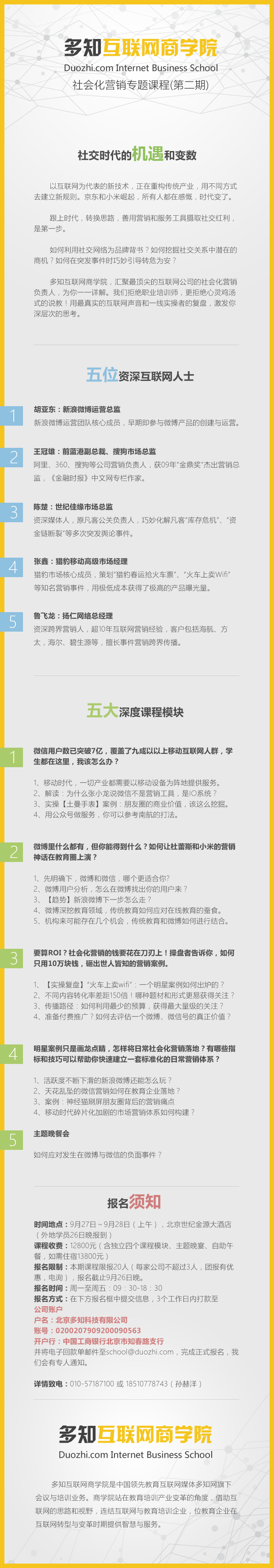 多知商学院社会化营销专题课程,汇聚互联网行业最顶尖的企业中的高管,拒绝非实操经验的职业培训师和心灵鸡汤式说教方式,真正通过当事人总结互联网最成功案例的管理实践,用真实的互联网声音,开拓视野和激发深层次的思考。帮助企业在一片混乱的互联网思维中真正理清方向,将变化转变为机遇。