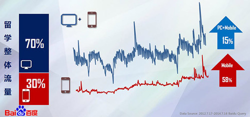 出国留学行业需求持续增长,无线端增长更加迅速,年增长率达58%。