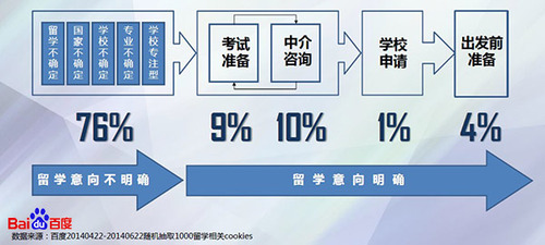 当留学意向明确之后,在网上的检索将更加明晰化结构化。整体分为:考试准备、中介咨询或两者并行、学校申请。后端行为即出发前准备,网民多检索诸如学校宿舍、学校周边生活信息、两国货币汇率差、机票、保险等相关信息。