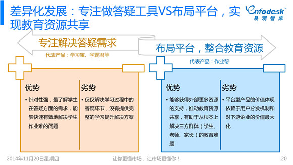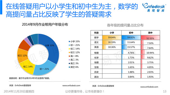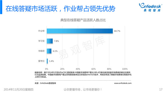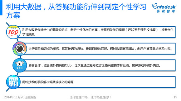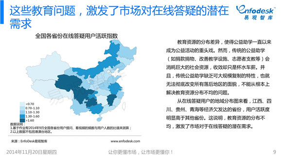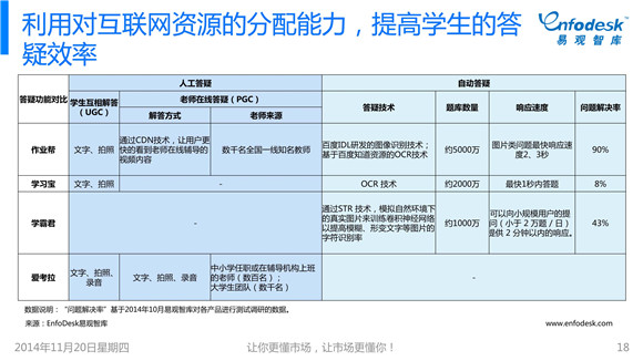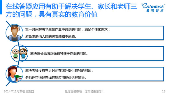 近日,互联网咨询公司易观国际近日发布了《中国在线答疑应用教育价值分析报告2014》。报告从目前国内教育行业的现状、在线答疑产品满足的用户需求方面、以及未来在线答疑工具的延伸发展的角度进行了阐述。
