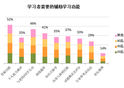 腾讯精品课《2014年中国在线学习用户行为调查》发现,在线教育产品辅助学习功能中,最受期待的是答疑和互动功能的实现,00后用户对此的需求尤为明显,但目前的平台还不能很好地解决这一点。