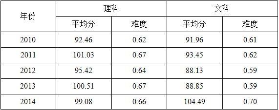 从表中可以看出,北京市高考数学平均分变化整体比较平稳,其中理科数学13至14年平均分基本持平。