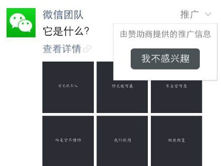 广告主投放的广告将出现在朋友圈的信息流当中,以文字信息和图片的形式呈现,点击文字下方的链接即可查看详情。另外在广告内测期间将会标注“推广”二字,以便用户区分,用户也可选择“我不感兴趣”不再接收其消息,实现广告的精准投放。在广告下方,用户还可以添加评论。