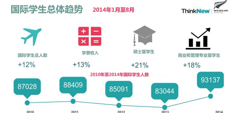 中国是新西兰国际教育最大的客源市场,2014年前两学期到新西兰留学的人数增长了2,978人,增长12%。