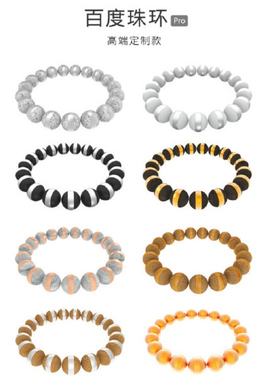 百度珠环,不同于大家熟知的腕带型可穿戴产品。百度珠环从外观上借鉴了中国传统手串的形式,改为当代流行的材质与配色。百度珠环可以自由拆卸组合每一颗珠子,不同的珠子搭载不同的功能模块,如:健康监测、运动轨迹监测、美颜拍照、实时搜索与翻译、家居智控、情侣互动、全息投影等新奇功能。力求打造一款时尚外观与东方气质完美融合的全球首款模块化可穿戴设备。