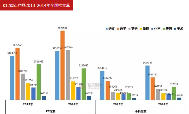 从上图来看,2013-2014年消费者对K12学科产品的关注情况,主科(语数英)的需求连续两年稳坐前三席,其中以语文、数学的关注量最高,两年轮流坐庄。艺术类学科中,舞蹈和美术的关注量对比悬殊,值得关注的是舞蹈连续两年杀入前四。PC端还是消费者主流检索途径,且2014年PC端和手机端对于学科产品的检索关注度都在上升,但两年中不同学科的关注量走势基本趋同。