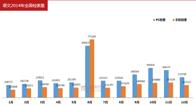 三大主科之一的语文,2013-2014年的全年检索量居于七个学科第二名,而全年的检索量出现两个高峰值,分别在6月、10-11月,而6月的总检索量是10-11月的近2倍,全年来看一枝独秀。而秋季学期的检索量普遍高于春季学期,其中10月份最高。语文在电脑端和手机端的检索量差距,在七个学科中是最小的,电脑端占少许优势,但在检索量最高的6月份,手机端势头强劲,成功反超。