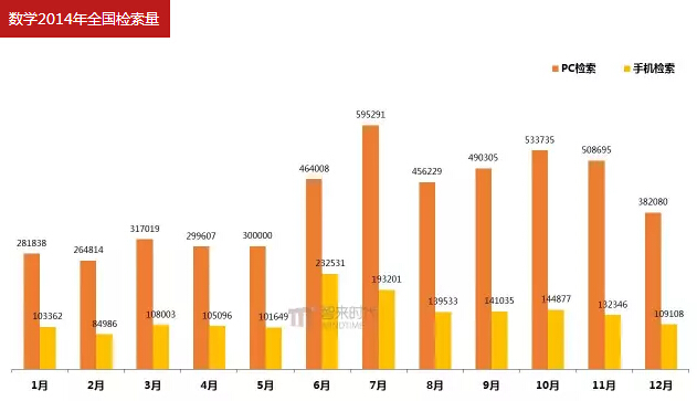 数学在三大主科中,近两年一直是pc端检索量第一,全年检索量与学科横向对比,消费者对K12阶段数学培训产品的需求持续最大。数学长期是不少学生头疼的学科,也是经过培训提分较明显的学科。2014年全年数学的检索量都较高,尤其自暑假前夕的6月起,数学的检索量一直保持在较高水平,7月达到全年检索量顶峰,十分坚挺,且全年关注幅度来看,数学学科检索量月份之间的悬殊并不大。数学产品的检索量在pc端和手机端差距较悬殊,pc端是明显主力。