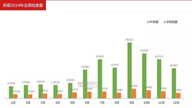 三大主科中的英语,在小学阶段的受重视程度不及语文和数学,但是在2014年pc检索量略超语文排在第二。近些年部分地区的中高考改革中,分值有所下降。英语在三大主科中的检索量也相对较少。2014年,英语产品的全年检索量整体幅度基本按月份呈现递增关系。与语文和数学检索量的最大值出现在暑假不同,英语的检索量最大值出现在秋季学期的9月份,此时正值学生入学。秋季学期是英语检索量的第一个黄金期,而一年内的第二个黄金期则出现在暑假。PC端仍然是绝对优先搜索渠道。