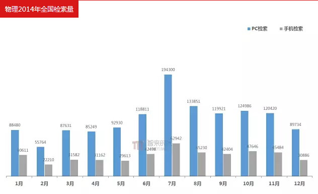 物理近两年的检索量在七个学科中一直徘徊于第五名。和数学学科一样,物理学科2014年全年检索量的最大值出现在7月份,暑假也是K12物理产品需求较大的时期。秋季学期的检索量很平均,需求也稳定。物理产品在春季学期的检索量略低于秋季学期,2月份检索量最低。pc端和手机端的检索量差距较大,pc端依然占优势。
