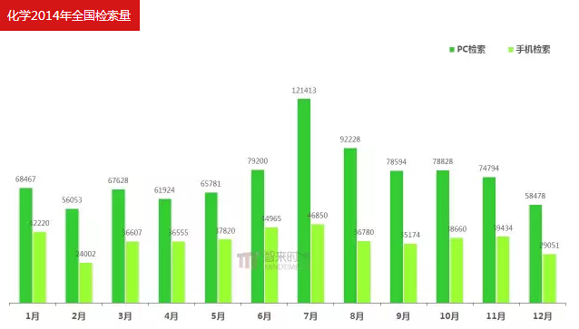 化学学科和物理学科在K12阶段的地位差不多,化学产品在2014年的检索量虽略少于物理,但变化趋势与物理几乎如出一辙。暑假也是化学课外培训的最热时期,7月仍达到最高峰值。秋季学期的检索量和春季学期的检索量都相对稳定,秋季略胜一筹。2月份也是一年中检索量最低的时候。与物理检索量不同的是,化学的检索量虽也是pc端占多数,但和手机端的差距相对较小。
