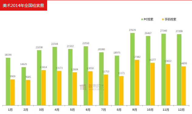 同为艺术类科目的美术,在2013-2014年的检索量远不及舞蹈,在七个学科中排位最末。就其自身2014的全年检索量来看,全年的检索量大致呈阶梯状,分为三个区间:1月—2月,3月—8月,9月—12月,层层递增,但不同区间的差距并不悬殊,可见全年的需求都较大且平均。与舞蹈相同,美术的高考艺考也集中在12月和1月,秋季学期也是美术产品检索量最大的时期。