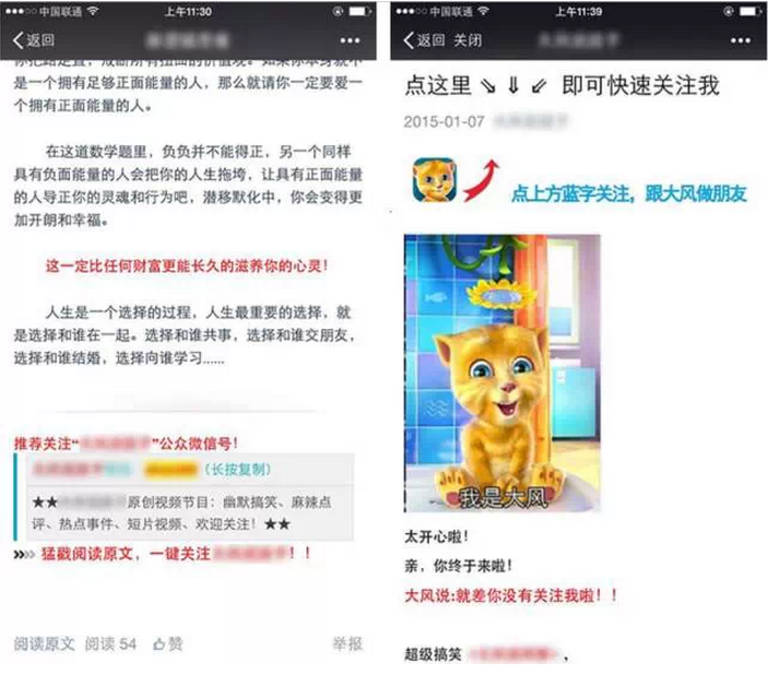 1.公众号文章内容对另一公众号引导关注,并通过“阅读原文”跳转到另一个公众号文章进行引导关注。