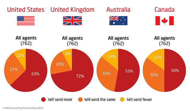约三分之一的留学中介机构表示,未来一年它们将向英国送去更多留学生;63%的机构表示,未来一年他们将向美国送去更多的留学生。