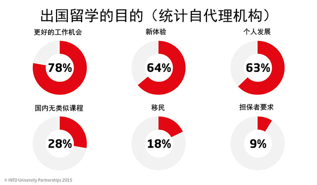 与此同时,中国留学生更多以“个人发展”为主要目的。74%的中国留学中介机构将“个人发展”列为留学生最大的动机。相比其他国家的留学生,“更好的就业前景”对大多数中国留学生来说只是一个次要的留学目的。