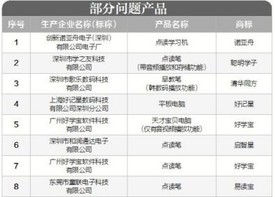 其中,“诺亚舟”两款点读学习机,检出“标记和说明”“电气间隙和爬电距离”两项目不达标;“清华同方”的一款早教笔,检出“电气间隙和爬电距离”项目不达标;“好记星”的一款平板电脑,“电源插头”项目不达标,等等。
