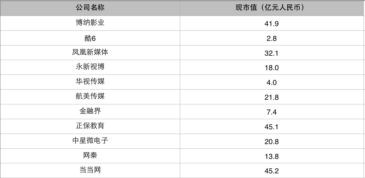 博纳影业2014的营收近16亿,市值折合人民币42亿,而营收24亿的华谊兄弟市值达526亿,营收12亿的光线传媒市值亦达416亿。