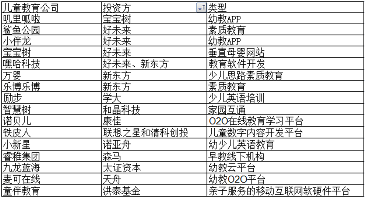 从图中可以看出,在儿童教育领域,各个投资方除了新东方、好未来这样的培训机构巨头,还有如康佳、诺亚舟这样的业务和儿童教育领域擦边的公司,希望通过投资儿童教育公司进入在线教育领域,同时,也能借此将自身业务和儿童教育进行一定程度的结合。