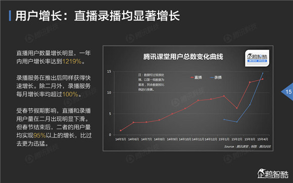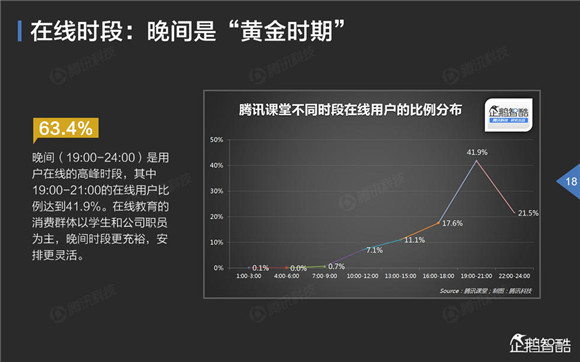 今日企鹅智库发布在线教育报告,报告显示,中国是除印度之外在线教育增长最快的国家,增长率为52%。直播用户数量明显,一年内用户增长率达到1219%。去年,付费用户增长明显,一年内,付费用户的增长率达到1670%,比整体用户的增幅还要高。19点到24点是用户在线的高峰时段。用户日均人均直播时长波动较大,整体呈增长趋势。月度增长率高达52 4%。