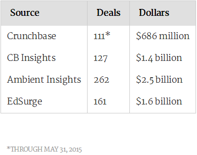 虽然如此,对在一些本是简单事实上出现分歧的情况,EdSurge还是感到惊讶。6月TechCrunch曾断言,“投资者似乎在2015年减少了对教育行业的投资”。1个月后CB Insights称,2015年第二季度“教育科技融资达到新高”,为7.65亿美元,暗示该行业的融资今年将创新记录。Ambient Insight也不甘落后,计算出今年上半年教育科技投资超过25亿美元。这个数字超过了Ambient统计的2014全年总额。