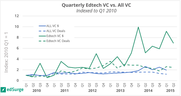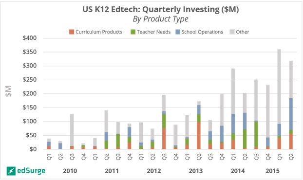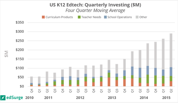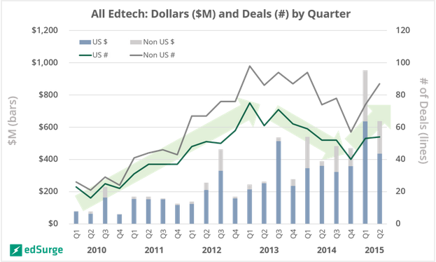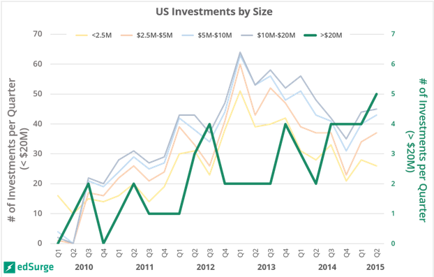 EdSurge对“教育科技投资”的定义包括了所有主要经营目标是提高所有学习者(无论年龄多大)的学习成果的科技公司。EdSurge同意Ambient Insight的社交金融是金融公司而非教育公司的观点。但EdSurge将AltSchool列入其中,因为该公司使用和开发了帮助学生学习的技术。下面的图表显示2010年第一季度到2015年第二季度的交易。
