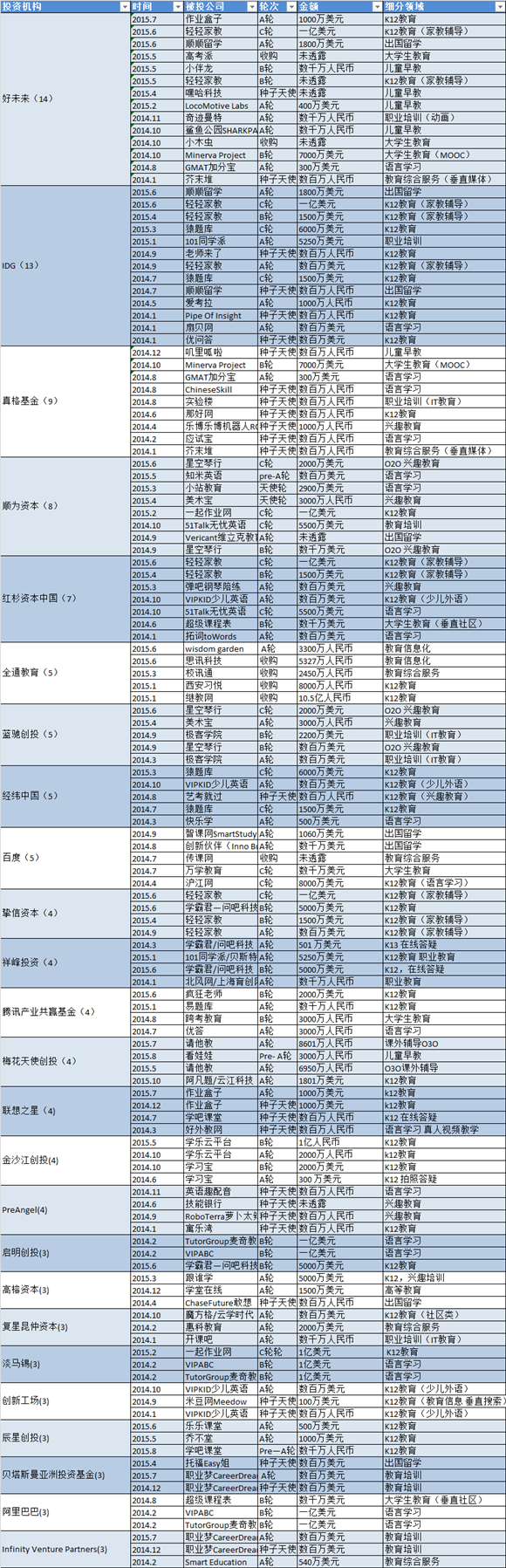 因为本人经常帮助互联网教育机构融资,和很多VC/PE打交道,我索性对过去一年(2014年下半年至2015年上半年)互联网教育的投资事件做了一个统计:以投资机构为维度统计了他们投资的企业、金额和轮次。