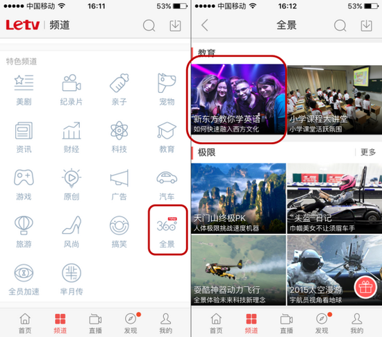 学员佩戴上VR头盔,在乐视视频APP上,点击乐视教育与新东方合作的“360°全景视频”,然后打开口语课堂视频,就能进行360°观看课堂,参与课程进度。