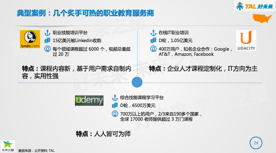 美国的教育行业目前有23家教育上市公司,上市公司主要集中在大学和职业教育领域,而明星初创公司主要集中在K12和职教领域。