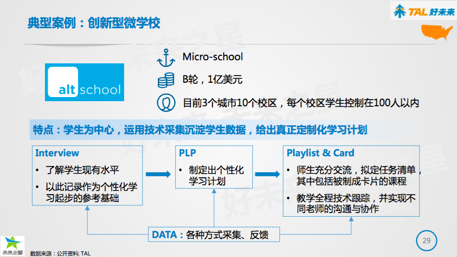 现在,美国已经出现了个别阶段的创新型学校,如小学阶段的Altschool,大学阶段的Minerva。中国目前还没有类似的学校出现,但是,随着民办教育标准化的提升,或许现在在做课外辅导等业务的公司也会有机会做这一块业务。