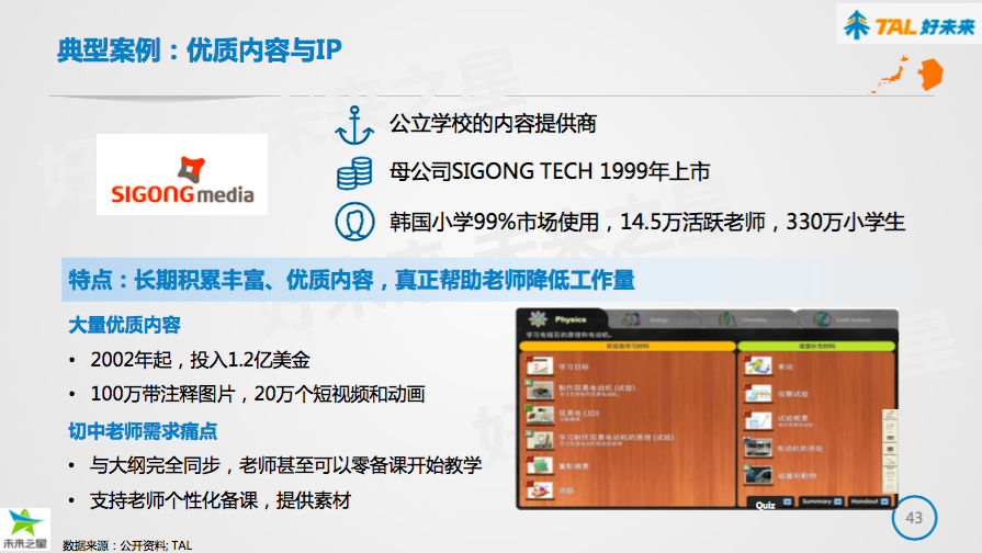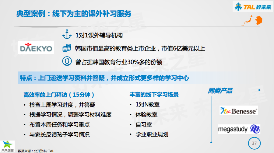 相对来说,中国的培训行业与日韩的培训市场更加相似,同样是升学辅导,韩国的DAEKYO的15分钟上门拜访模式,在短时间内完成答疑、布置任务、反馈学习情况等,这样做主要是为了提高人效。