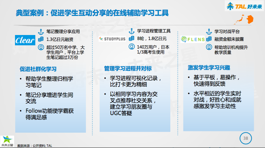 同时,在线辅导学习工具的加入,使得培训的效率提升,比如学习进程的管理StudyPlus,笔记整理分享类应用Clear等。