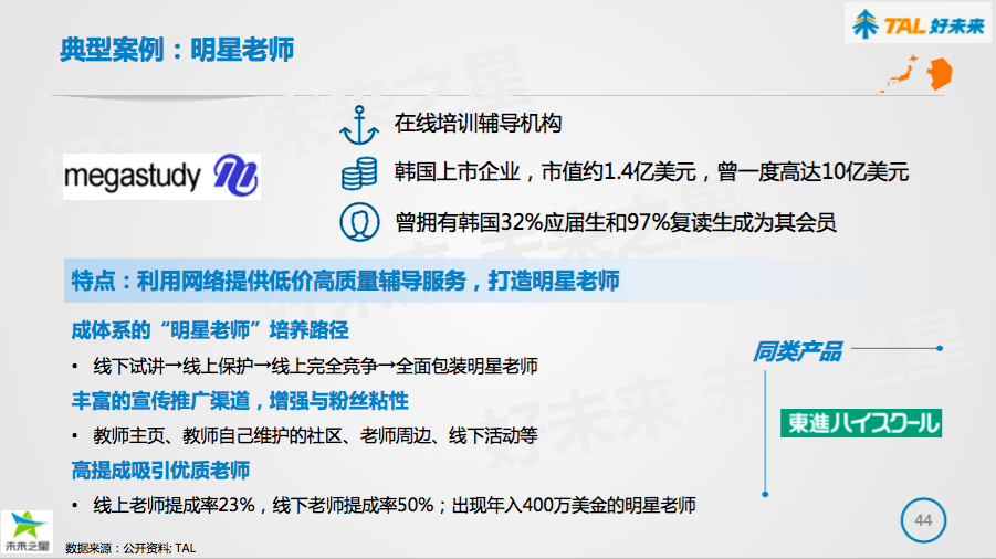 日韩培训市场本身的市场比较小,导致了竞争更加激烈,因此促使日韩市场出现了培训机构成体系化的“明星老师”培养路径的形成,以及老师自身的运营和推广渠道对于学生招生渠道的提升。