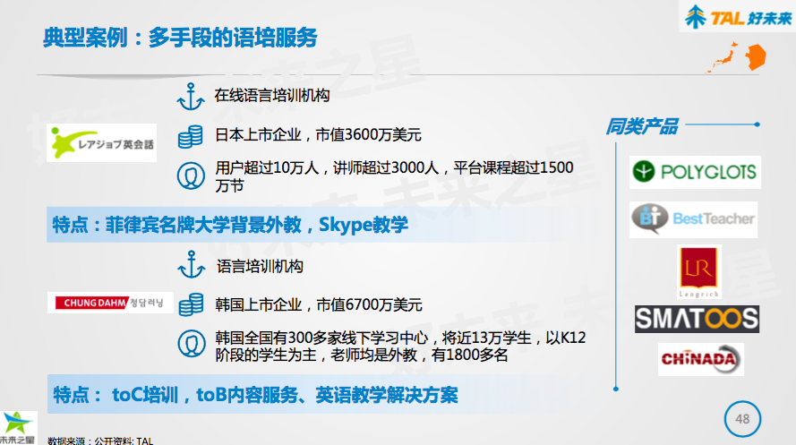 日韩市场的四个特征是:K12提分升学导向盛行;重运营、服务、内容与师资,追求极致;语言培训热;老年教育的需求正在逐渐出现。