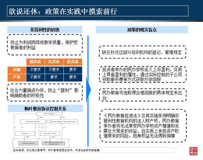 首先,为什么我们就教育政策写了比较深入的长篇报告?一方面,教育是一个政策导向型的行业,政策的导向影响教育行业的发展。另一方面,我们平时在和一些教育机构交流的过程中,发现一些大型教育机构的领导,他们对自己的教育机构所处在的一些政策环境也并不是特别的清楚,比如说像他们下属的一些分支机构,到底是经营性的机构,还是说他们是登记为非营利性机构,他们自己也并不是非常清楚。