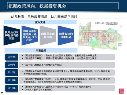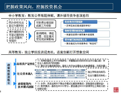 以上是我们教育行业总体的政策,同时我们还对幼教、中小学教育,高等教育跟职业教育几个细分领域里面的细分的教育政策和相关的投资机会进行了一个挖掘。