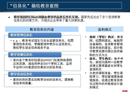 最后一个领域就是教育信息化领域,大家可能更加关心。我们认为教育信息化有三个层次的内涵,第一个就是教育管理的信息化,教育管理信息化涉及到很多方面,我举几个例子。比如说像教育考试招生和监管的信息化,校园管理的信息化,学籍管理、学历教育的信息化、学生就业信息服务的信息化。