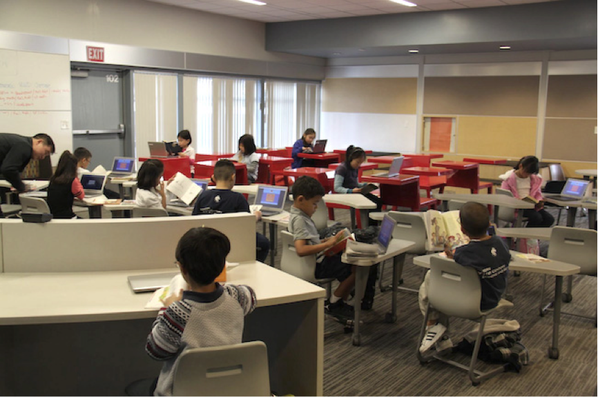 记者佩蒂·戈麦斯和笔者去参观时,三年级学生们正坐在一间宽敞而通风良好的学习实验室里鲜亮的红色椅子上,每个人都在静静地阅读他们从Reading Counts中挑选的一本书——Reading Counts是一个自适应程序,能向他们推荐有助于提升某个方面(比如词汇)的书。很多记者和教育工作者都来参观过这间先进的实验室,所以教师戴安娜·塞姆洛根本不用介绍这些举着相机的访客,而孩子们也是全神贯注、毫不分心。孩子们去吃午饭的时候,学区教监卡里·松冈和技术总监宋俊坐下来接受了采访,将有关该程序的信息娓娓道来。
