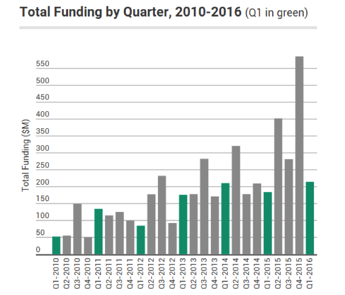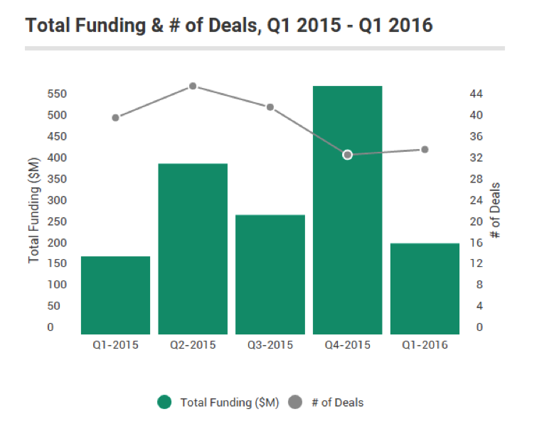 图表1:2016年第一季度,融资金额从2015年第四季度的5.85亿美元下降至2.15亿美元。这种下滑看似是灾难性的,但是2016年第一季度的交易总金额与2015年第一季度相比,其实出现了同比增长。事实上,2016年第一季度是过去6年来第一季度融资总金额最高的(参见图表4)。交易总数量在第一季度保持稳定,为35笔(2015年第四季度为34笔)。