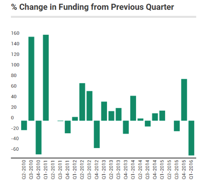 图表2:尽管如此,2015年第四季度到2016年第一季度的环比下滑幅度依然是EdSurge自2010年开始追踪记录以来最大的。如此之大的融资环比下滑幅度此前仅出现过两次,分别是2010年第四季度(-64%)和2012年第四季度(-52%)。在过去24个季度里,融资环比下滑出现过9次。
