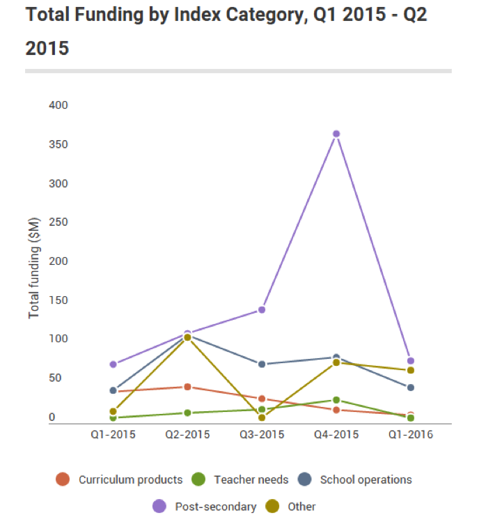 图表4:现在并非打造课程表或教师所需工具的好时机。从融资金额来看,这两类公司过去一年中在EdSurge划分的5大领域中几乎一直垫底。课程表和教师所需工具这个类别一共获得了2.28亿美元投资,远低于学校经营(3.65亿美元)或中学后教育(7.92亿美元)产品。