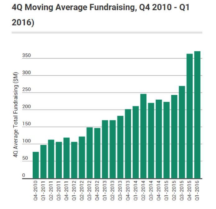 图表5:正如前文所说的,目前尚未出现恐慌。教育科技投资是一种长线投资,认真投资这一领域的投资者都会明智地宣扬耐心。过去4个季度中教育科技融资总金额的移动平均线表明,该行业仍在健康发展,即便在2016年第四季度出现下滑。(在以下图表中,每一季度的数据代表该季度与之前三个季度的平均融资金额。)从这个角度来看,2016年第一季度的融资金额移动平均线有所增长,虽然该季度融资总金额下滑。