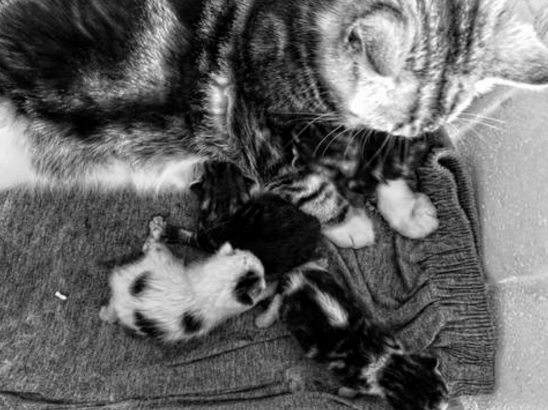 我家一岁半的小猫最近生下了四只小猫,身为美短虎斑加白的她,和同样美短虎斑更加白的公猫居然生下了两只纯虎斑、一只跟她一模一样的加白,还有一只几乎全白。连她自己看到这只全白小猫的时候,感觉也懵逼了好一阵子才缓过来。