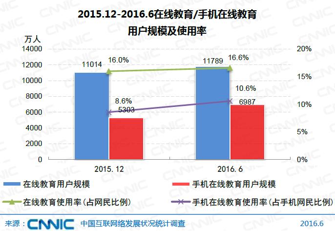 报告显示,2016年上半年,我国在线教育用户规模达1.18亿,较2015年底增加775万,增长率为 7.0%;在线教育用户使用率为16.6%,较2015年底基本持平。手机在线教育用户规模为6987万,与2015年底相比增长了1684万,增长率为31.8%;手机在线教育使用率为10.6%,相比2015年底增长2个百分点。