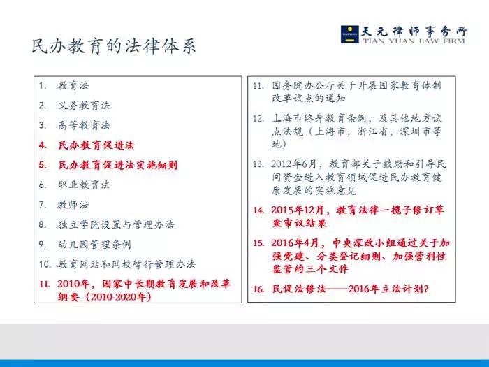 这个表是最核心,最基本的法律框架。教育行业的法律法规可能有几百个,除了前三个,教育法、义务教育法、高等教育法这些具体领域的基本法规以外,像第4、第5项,民办教育促进法和实施细则,2002年、2003年出台的,这是当时非常巨大的进步,一个里程碑。这两个法规里面,确定了从原来的完全非营利性变成了要求合理回报和不要求合理回报的分类。从2002年、2003年起,民办教育机构开始可以在事实上、一定程度上获得营利性的收益,但是法律上仍然属于公益性行业。
