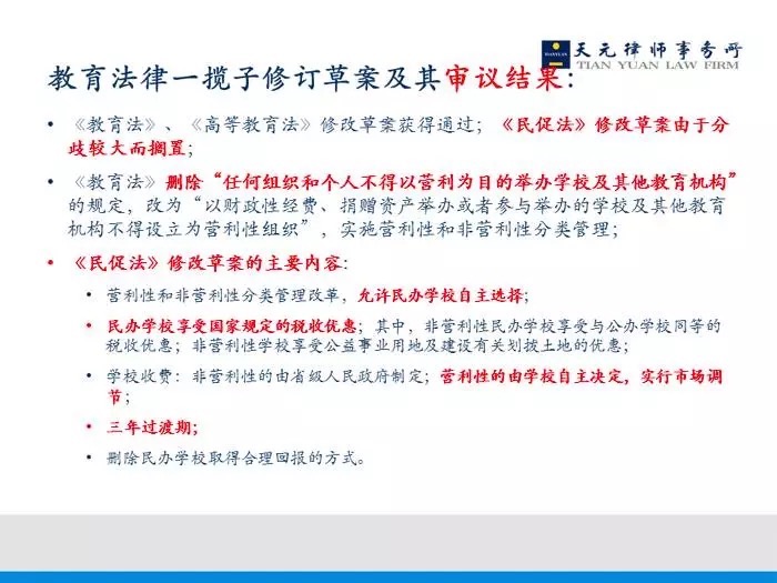 去年12月底,教育法律一揽子修订草案的内容及其审议结果。去年年底,《教育法》、《高等教育法》、《民办教育促进法》三个法律统一进行修改,只有前两个过了,《民办教育促进法》由于分歧巨大搁置了。《教育法》改的最大的一条是,删除了“任何组织和个人不得以营利为目的举办学校”,改为“由财政性经费、捐赠资产举办或者参与举办的学校及其他教育机构不得设立为营利性组织”。《教育法》的这一条修改给营利性和非营利性的分类管理开了绿灯。开了绿灯以后怎么实施,还得取决于《民办教育促进法》的修改。但是《民办教育促进法》没改了。
