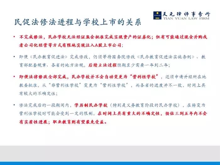 3、即便法律修改全部完成,民办学校是不是会自动变成“营利性学校”?不是的。我估计是这样的,对于一个民办学校,如果是培训类的,大家可能就不办学校了,直接走公司化经营,直接通过企业化经营的形式去做了。学历制的学校没办法,还得到你所在地的教委去申请变更,把你自己变成营利性的学校。而这个过程是要经过一个行政许可的,是要有审批的,不能自动实现的。资本市场不要误解,以为《民办教育促进法》一改完,我自主选择,一选就改了,不是像换一张营业执照那么简单,要批的。