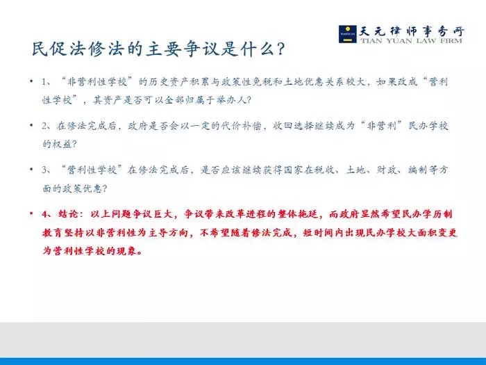 所以由于上面这三个方面的巨大的争议,导致了整个立法改革进程的拖延。从我的角度观察,政府显然是希望民办的学历制教育坚持以非营利性为导向的,这在中央深改小组的文件里都体现出来了。不希望随着修法的完成,在短期之内民办学校大面积改成营利性的,可能对整个社会,包括教育产品的服务是会带来一些冲击的。
