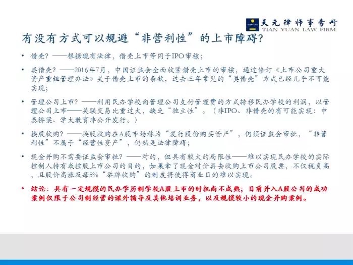 在法律修改完成之前,非营利性问题解决之前,教育类资产进入资本市场有没有其他的方式?从我个人的职业经验上来看,经常听到的一些方式,第一个方式是借壳,IPO不行能不能借壳?2013年底开始,借壳等同于IPO审核了,上市公司和证券公司的人很清楚。