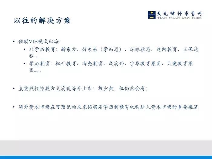对于民办教育的非营利性,以往的解决方式是,大家一股脑往海外走,去海外上市,用VIE的模式,包括刚才讨论比较多的新东方、好未来都是我们做海外上市的,包括现在的枫叶教育、海亮教育等等。