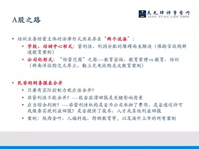 进入资本市场非常相关的问题,就是民办非企业单位,就是我们说的民办学校,能不能够被他的举办人合并财务报表。我不是会计师,这个问题不能断言,从我的观察来讲,有这么一些观点或者是争议。第一个观点是,不管民办学校是营利性还是非营利性,我只要看他有没有实际控制力,会计准则上来讲,只要有实际控制力,就应该合并财务报表。第二个观点,有实际控制力也不行,赚了钱也不能分,合并报表就是误导投资者。第三个观点,证监会会计部曾经在有一年的上市公司年报的监管报告里面提到,非营利性的单位能不能合并报表要综合的看,非营利性机构是不是为公司承担了一些研发费用、销售费用,是否通过一些许可服务让他的举办人获得了利益上的回报,如果是的话,有可能也要合并报表。历史上也有一些案例,比如说陕西金叶,还有人福科技、新三板的朗顿教育,这些都是合并了财务报表的。